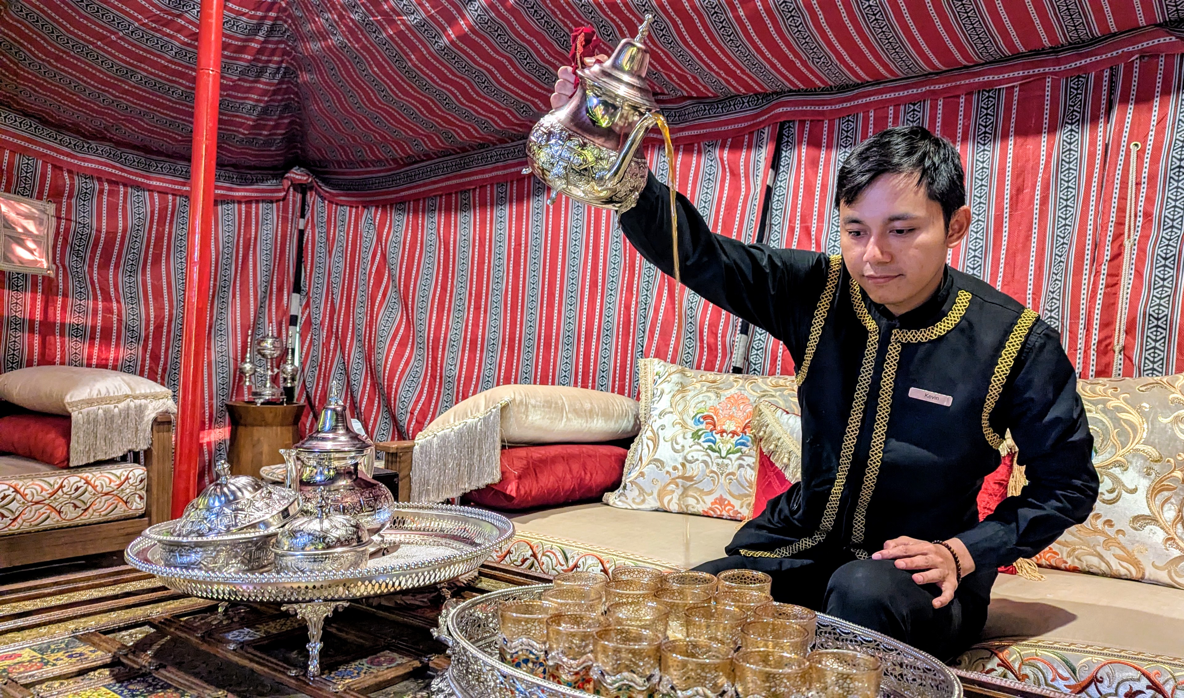 Top marks for ambiance! As you walk past Park Hyatt’s dreamy pool, the iftar setup looks like a little village - it’s both peaceful, with gentle live oud music and thousands of twinkling lights, and bustling - striking the perfect mood to break your fast and bring your guests for a truly special iftar experience. Gorgeous bedouin tents surround the space, filled with live stations, buffet selections and seating areas to enjoy tea and coffee.