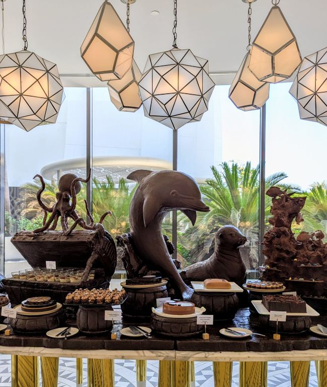 Confession time: we’ve buried the lede here. Call us biased, but hands down the best thing about White brunch has to be the desserts. The chocolate table is a work of art, and the thought of smuggling that giant chocolate dolphin out has crossed my mind more than once. Try the Earl Grey mousse cake (10/10 consistency), tiramisu, the peanut caramel chocolate mousse and the passionfruit hazelnut chocolate bites. The patisserie selection is equally gorgeous - and beautifully executed. Delicate pineapple cheesecake bites, berry macarons, a perfect strawberry Charlotte, pistachio raspberry cake - the fruit-based desserts are miniature works of art and a lovely contrast to the chocoholic’s dreamscape up the other end.