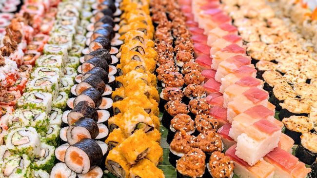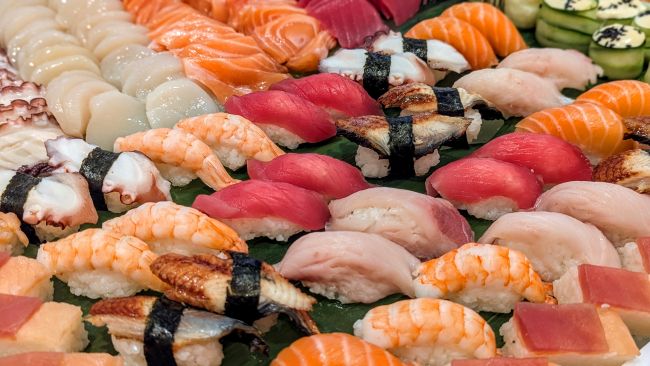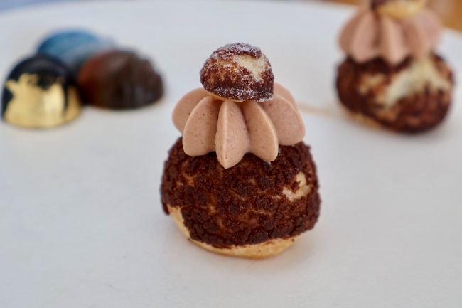Where to begin? Back to the chocolate table later - although yes, the first thing we ate was indeed a (passionfruit chocolate dessert) - but you’ll be lured straight to the seafood. Overflowing vessels filled with lobster, crab, and freshly shucked oysters on ice compete with tiers of gravlax and a gorgeous arrangement of sushi: we counted at least 12 different types of maki and nigiri, almost too pretty to disturb.