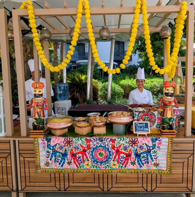 Next up? White nails their meat selection: from slow cooked lamb leg, prime beef and roasts inside to the live grill station outside, where steak, fresh prawns and delicious kebab are grilled to your liking over hot coals, there is no shortage of protein. A whole, salt-baked salmon is delicately flaked and ready to devour, and while you’re outside, detour via the other live stations - they’re more than pulling their weight. Lebanese falafel, Indian chaat and freshly made pasta are all whipped up while you wait.